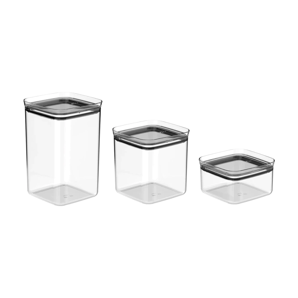 • Design Inteligente: Potes empilháveis que economizam espaço e oferecem visualização prática do conteúdo.