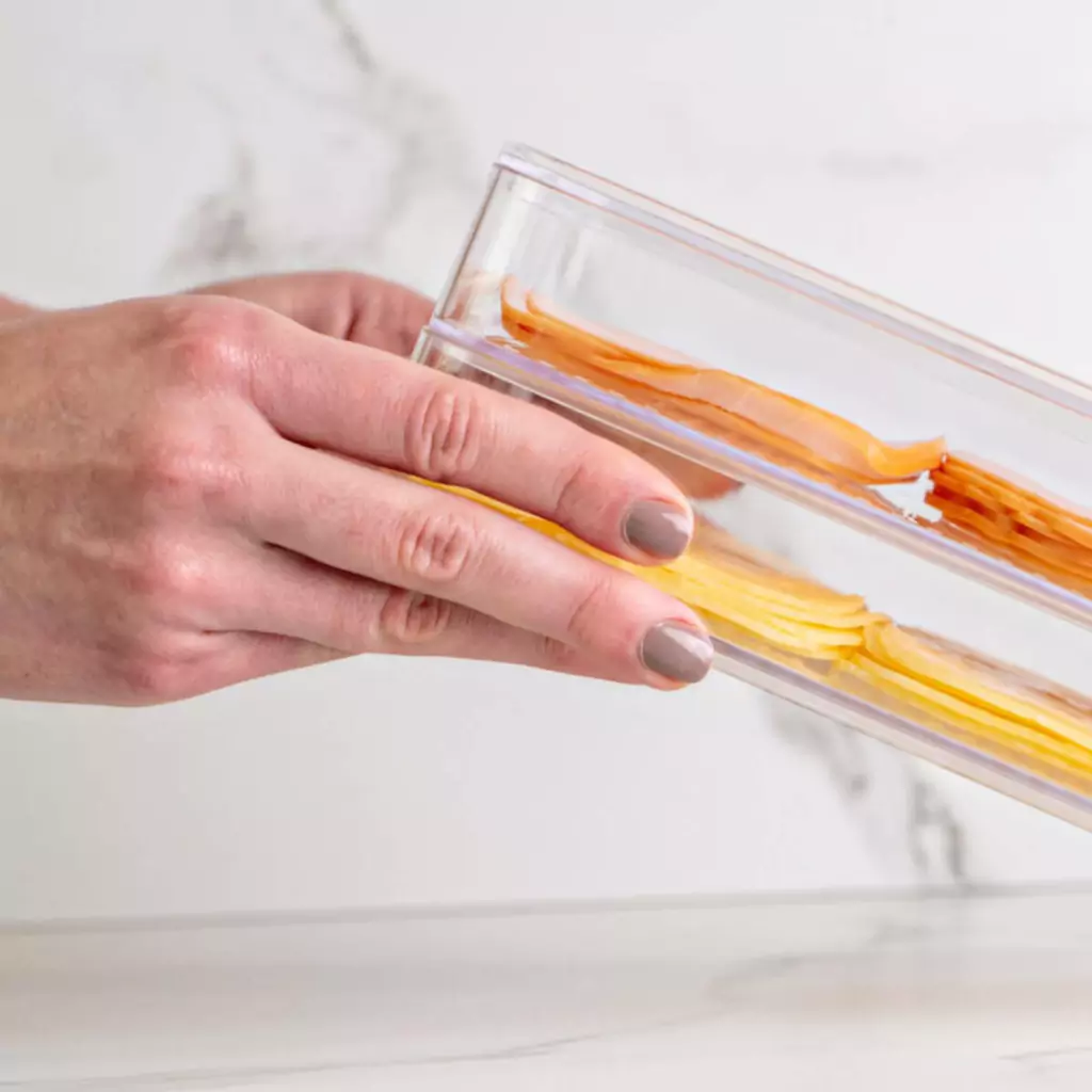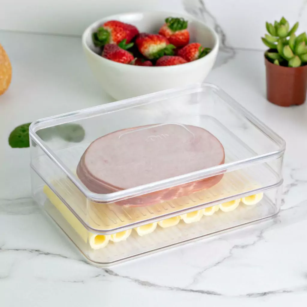 O Porta Frios Duplo Clear Fresh é o novo padrão de transparência para quem procura acondicionar e servir frios de forma simples e prática, promovendo beleza e funcionalidade para o dia a dia e ocasiões especiais. Empilhe, encaixe e enxergue facilmente os frios armazenados, mantendo tudo em ordem. Com design minimalista, ele combina com todos os tipos de cozinha, trazendo harmonização entre cor e transparência para facilitar a visualização dos itens sobre a mesa. Outro diferencial da linha está na sua superfície interna que possui uma grade e ranhuras, além de uma base removível que evitam o contato dos frios diretamente na superfície do produto.
