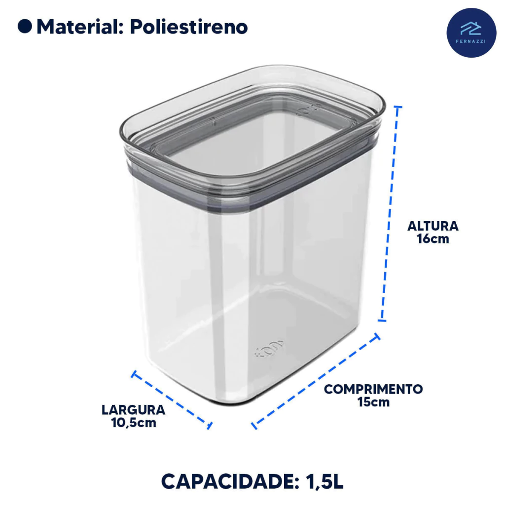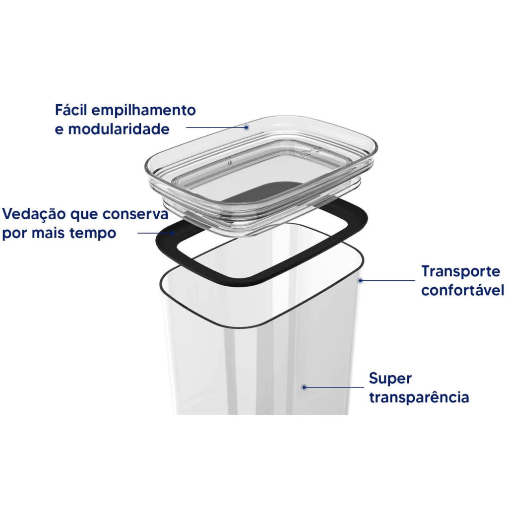Prolonga o Frescor: Vedação hermética que mantém alimentos frescos por mais tempo. Design Inteligente: Formato que permite um empilhamento eficiente e seguro. Organização Prática: Transparência total que facilita a identificação rápida dos conteúdos. Uso Versátil: Apropriado para varios produtos, desde alimentos até itens de uso diário. Manutenção Simples: Design que evita acúmulo de resíduos, contribuindo para uma cozinha mais higiênica. |