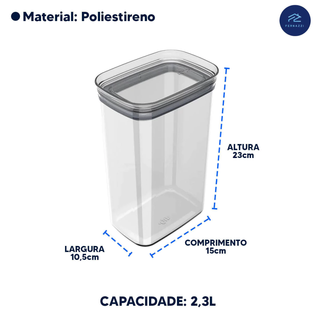 Prolonga o Frescor: Vedação hermética que mantém alimentos frescos por mais tempo. Design Inteligente: Formato que permite um empilhamento eficiente e seguro. Organização Prática: Transparência total que facilita a identificação rápida dos conteúdos. Uso Versátil: Apropriado para varios produtos, desde alimentos até itens de uso diário. Manutenção Simples: Design que evita acúmulo de resíduos, contribuindo para uma cozinha mais higiênica. |